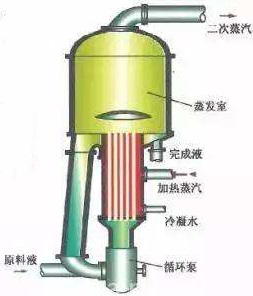 強(qiáng)制循環(huán)蒸發(fā)器的工作原理就是,原料液由循環(huán)泵自下而上打入,沿加熱室的管內(nèi)向上流動(dòng)。蒸汽和液沫混合物進(jìn)入蒸發(fā)室后分開,蒸氣由上部排出,流體受阻落下,經(jīng)圓錐形底部被循環(huán)泵吸入,再進(jìn)入加熱管,繼續(xù)循環(huán)。