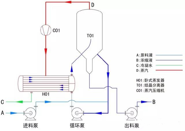晶漿從循環(huán)管路中用出料泵輸出。蒸發(fā)分離器內(nèi)的二次蒸汽經(jīng)過(guò)蒸發(fā)分離器上部的分離和除沫裝置凈化后輸送到壓縮機(jī),壓縮機(jī)把二次蒸汽壓縮后輸送到換熱器殼程用作蒸發(fā)器加熱蒸汽,實(shí)現(xiàn)熱能循環(huán)連續(xù)蒸發(fā)。